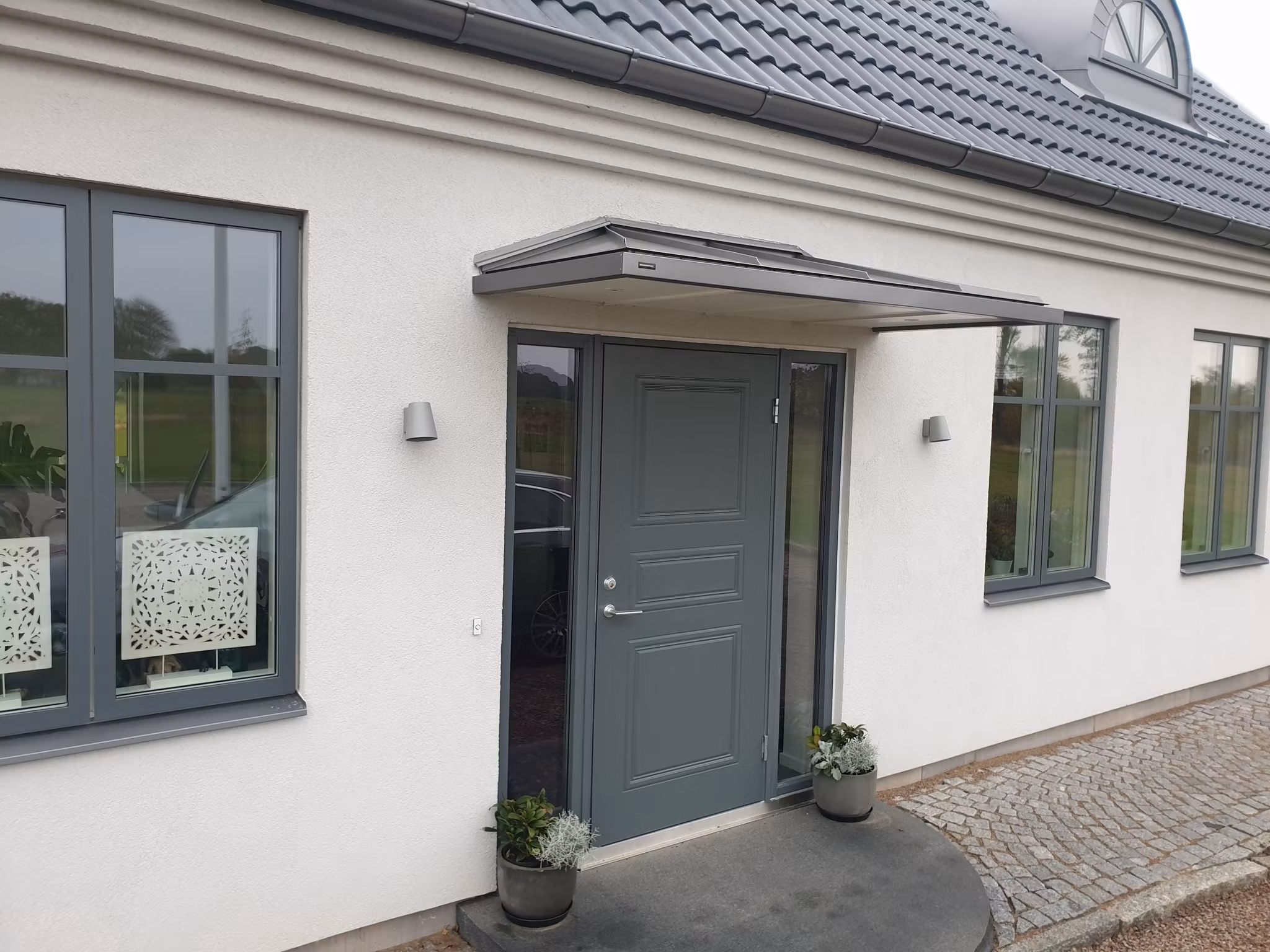 Entrétak Hipped är en av våra storsäljare. Detta entrétak har bland det mest klassiska utseendet av skärmtak. Med sitt valmade dubbelfalsade plåttak är detta tidlöst och passar de flesta fastigheterna.
