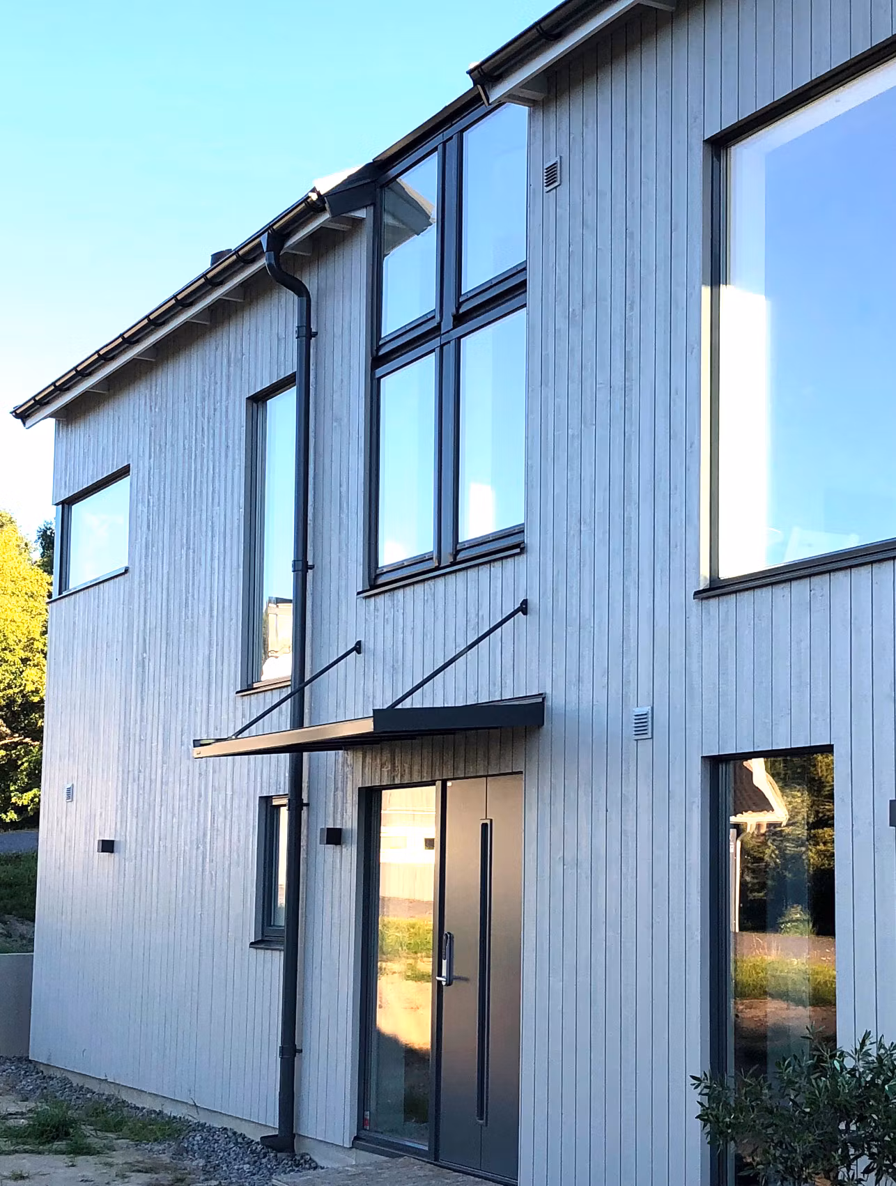 Entrétak Modern Flat är ett trendigt entrétak med platt utseende. Entrétaket hålls upp av snedstag i naturanodiserat aluminium som ger ett slimmat och trendigt utseende. Dragstagen är till fördel för er som söker entrétak till områden där snölasten är högre.