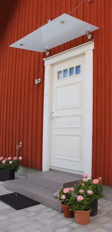 Entrétaken från vår serie Easy Collection är Designtaks trendigaste tak. Ett glastak passar perfekt när ni önskar att få stort ljusinsläpp. Här kan ni även välja på tre olika djup på takmaterialet. 800mm för er som önskar ett mindre tak och kanske inte har så mycket plats ovanför dörren att fästa i. 1000mm djup när ni önskar ett bättre skydd för dörren och har gott om plats ovanför att montera i. 1200mm djup när ni önskar ett rejält skydd för er entré. Trots sin storlek så upplevs detta tak inte klumpigt utan smälter in bra på de flesta fasaderna. Konsolerna består av rostfritt stål AISI 316 som klarar alla tuffa väderförhållande. Designtaks Easy Collection tak passar såväl på villor som flerbostadshus och även kommersiella fastigheter som behöver ett snyggt entrétak.